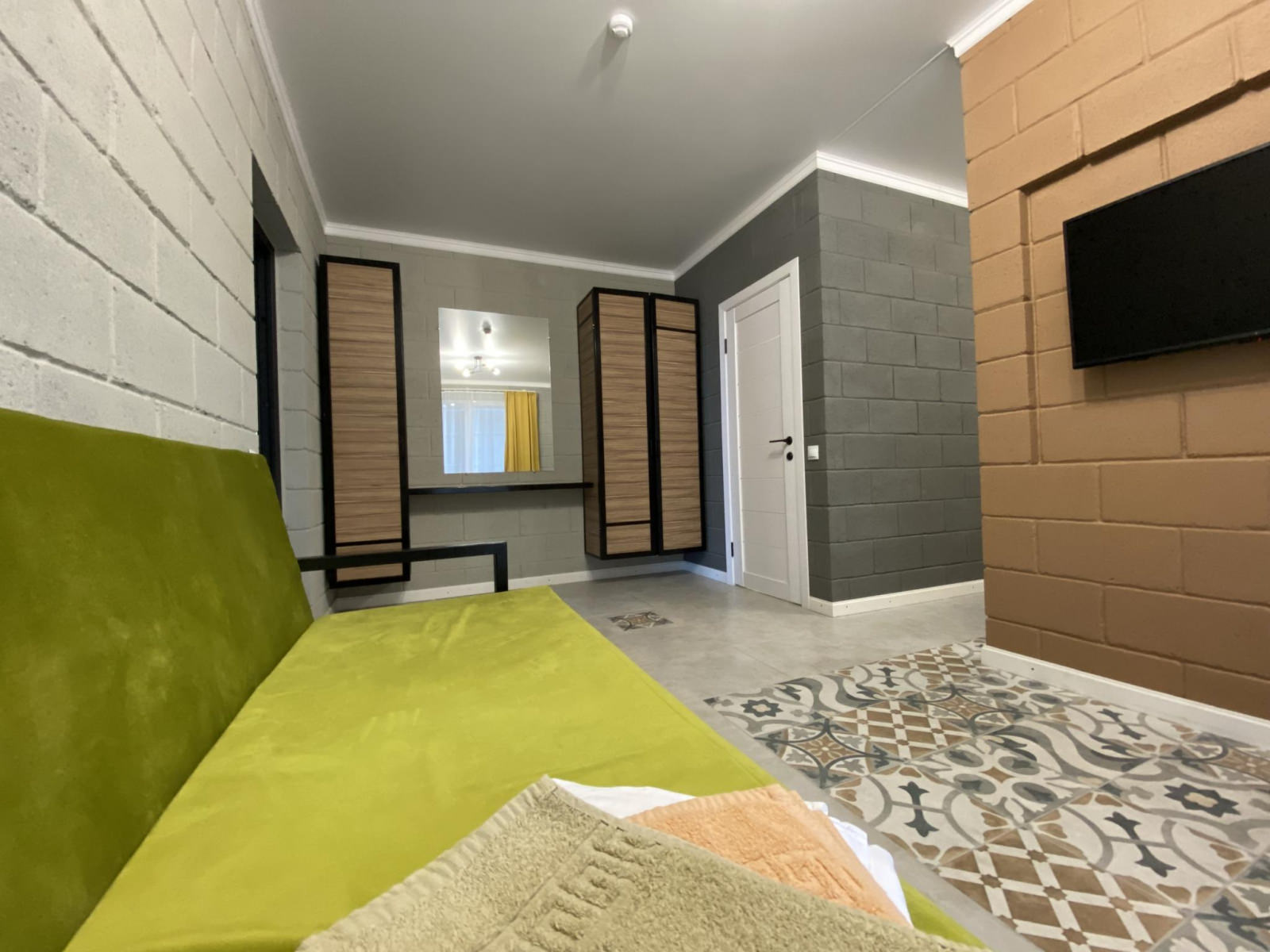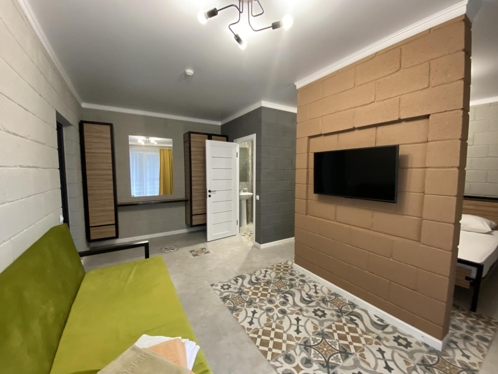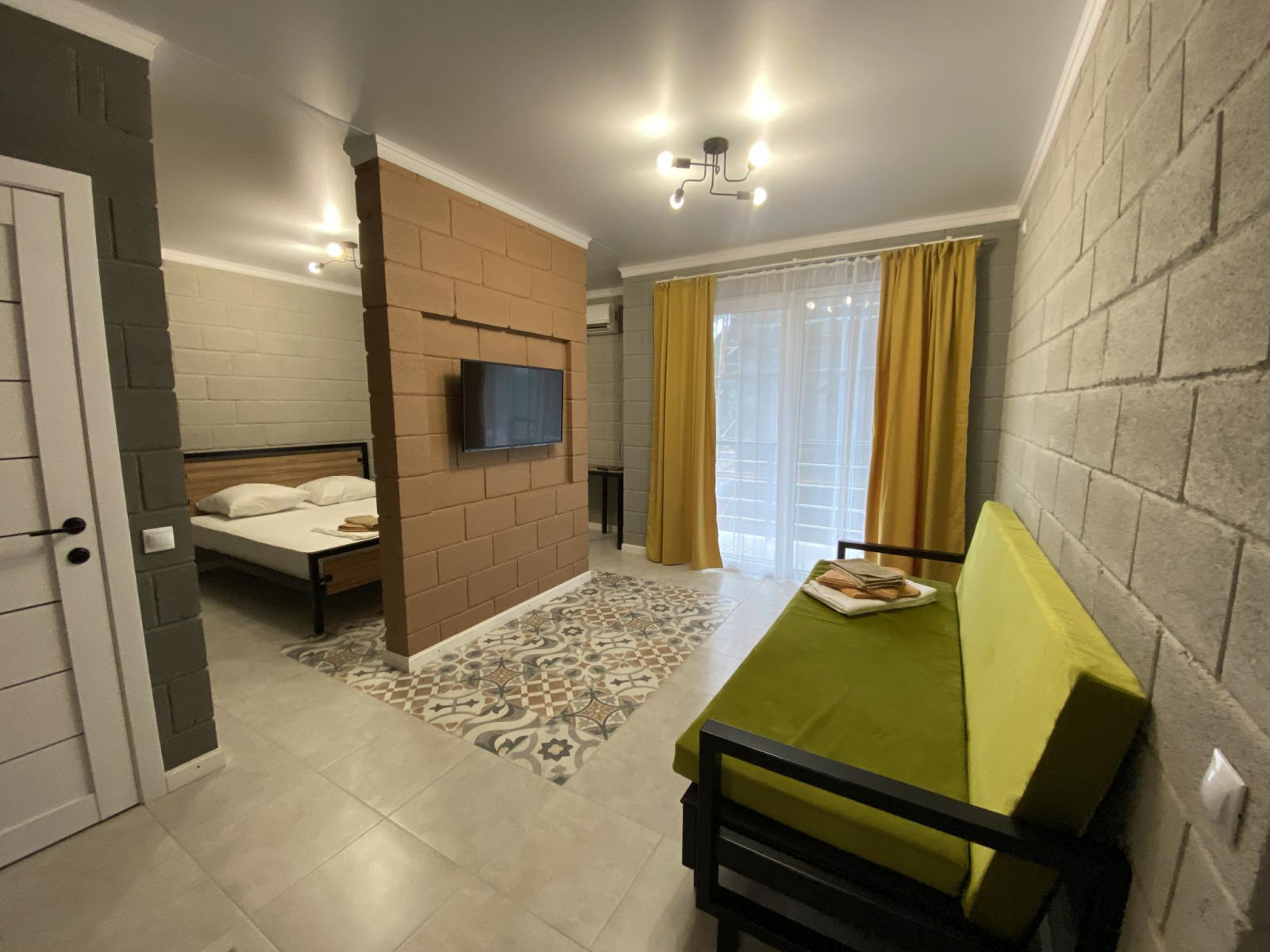 Студия с боковым видом на море. Максимальное размещение 4 человека. В номере: двуспальная кровать и диван-кровать. Номер разделен перегородкой, по обе стороны которой размещены 2 телевизора, что очень удобно для отдыха с детьми. Так же номер оснащен кондиционером, холодильником, балконом с мебелью.